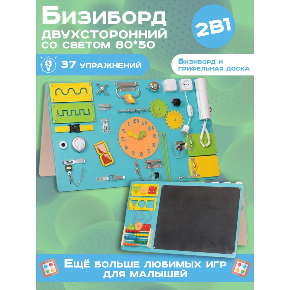Бизиборд двухсторонний Макси 80х50 см со светом бирюзовый